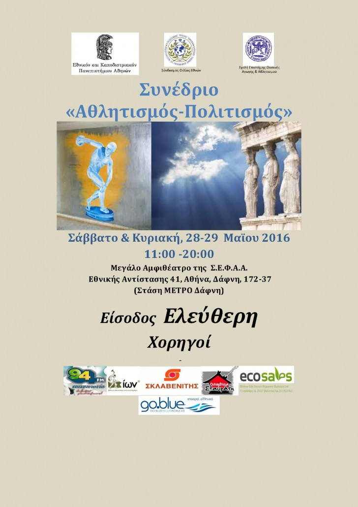 Ο Σύνδεσμος Φιλίας Εθνών (Σ.Φ.Ε) και οι συνδιοργανωτές Σχολή Επιστήμης Φυσικής Αγωγής & Αθλητισμού (Σ.Ε.Φ.Α.Α) του Εθνικού και Καποδιστριακού Πανεπιστημίου Αθηνών (Ε.Κ.Π.Α) & Αθλητική Νεανική Ακαδημία Μελισσίων «Ο ΑΘΛΟΣ», πραγματοποίησαν συνέδριο στις 28 και 29 Μαρτίου 2016 στο Μεγάλο Αμφιθέατρο της Σ.Ε.Φ.Α.Α στη Δάφνη, με θέμα «Αθλητισμός – Πολιτισμός» .